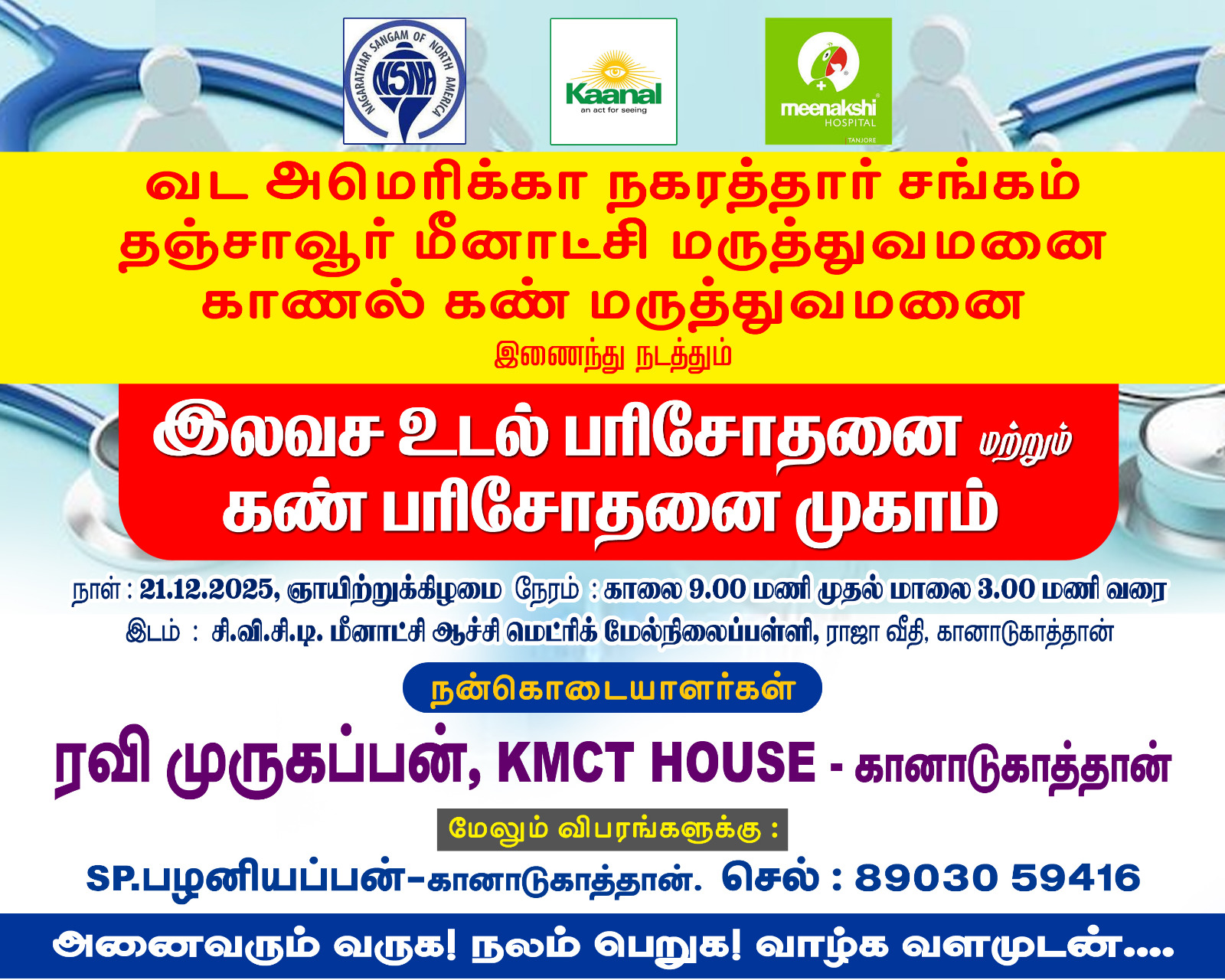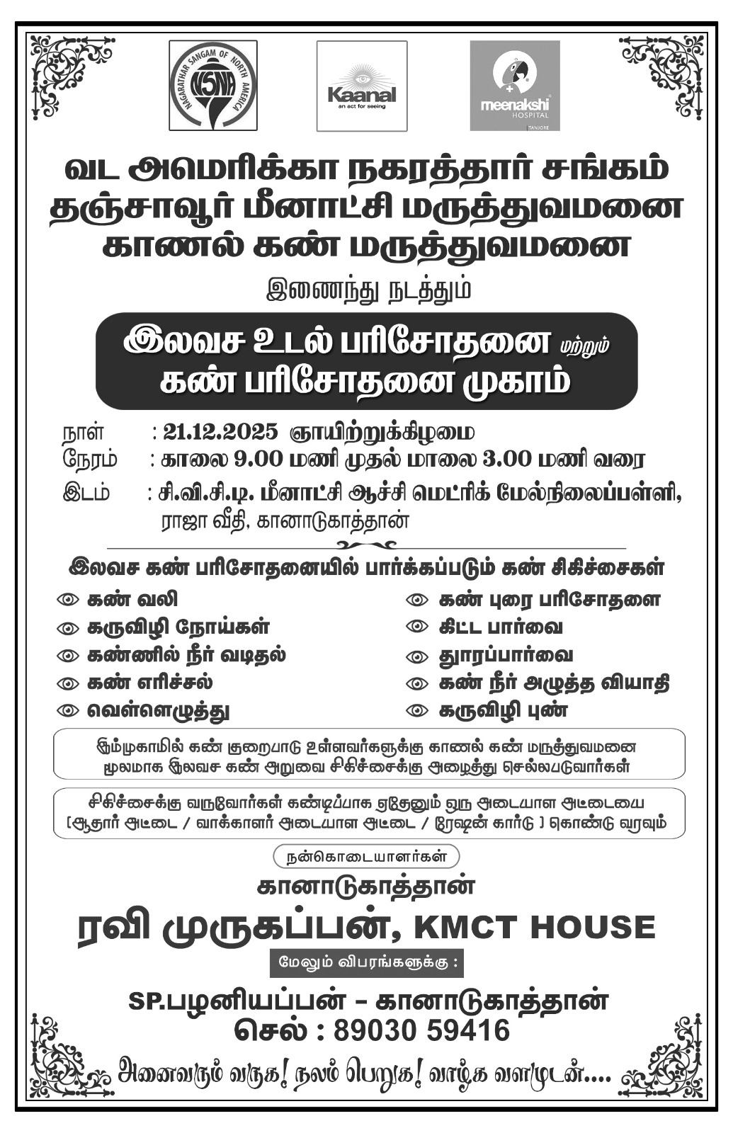 Free Medical & Eye Camp NSNA x Kaanal x Meenakshi Hospital 21 Dec 2025 | 9 AM – 3 PM CCT Meenatchi School, Kanadukathan Health check, eye screening & more! Community first. Care for all.