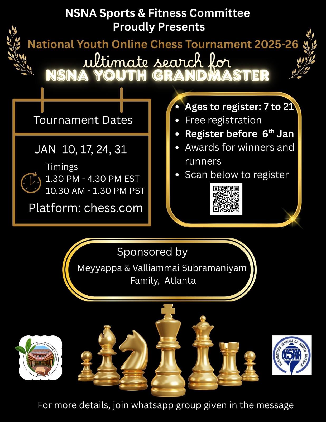 For NSNA National Online Chess tournament 2025-26, 1, Register at https://bit.ly/45oYi2y before 6th Jan. 2, For more details, join whatsapp at https://chat.whatsapp.com/Lp9YQtdzktI6WFUGp5WF8r