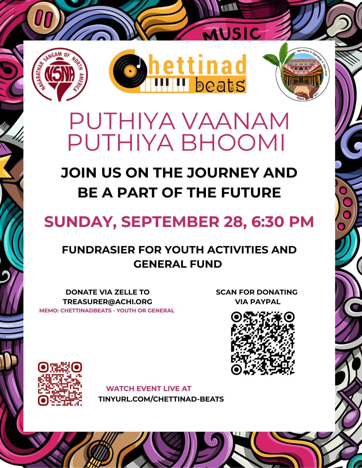 NSNA and Chettinad Beats team proudly presents a virtual musical concert on Sunday, September 28th 6:30 PM Eastern. Entirely conceived, designed, performed and presented by our own Nagarathar talented Youths with experienced Achis and Annans!