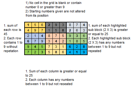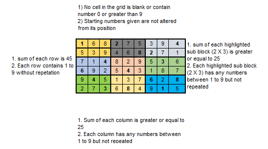 - 2 X 3 subgrids: The grid is divided into nine (2 X 3) blocks, and each of these blocks can contain the numbers 1 through 9 without repetition and sum of each grid should be greater or equals to 25