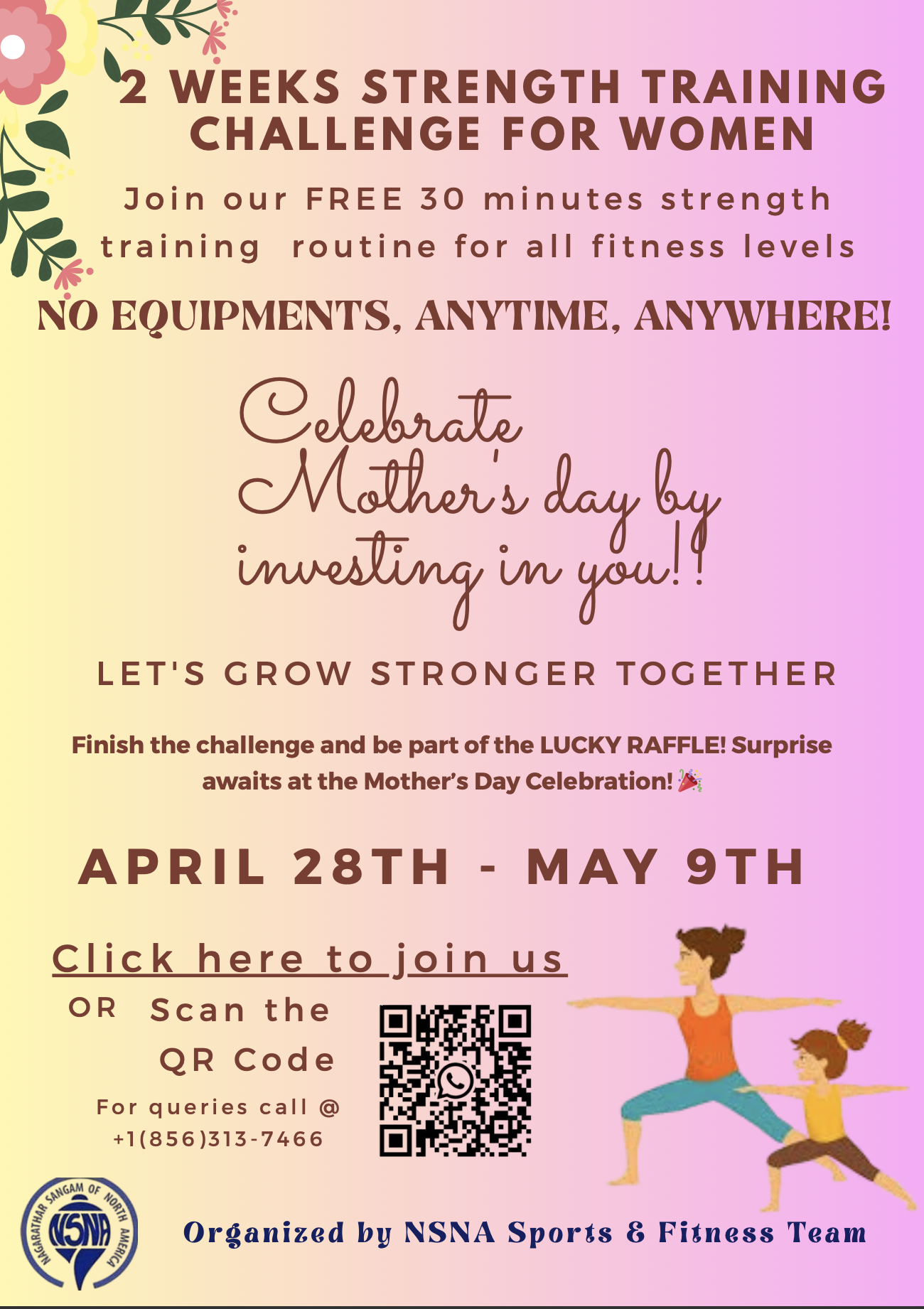 The "Strength Training Challenge for Women" is a free, 30-minute strength training routine designed for all fitness levels that requires no equipment and can be done anytime, anywhere. The challenge runs from April 28th to May 9th and encourages women to celebrate Mother’s Day by focusing on their own health. Participants who complete the challenge will be entered into a raffle, with a surprise prize to be revealed at a Mother’s Day celebration. The event is organized by the NSNA Sports & Fitness Team, and more information is available via a QR code or by calling the provided phone number.