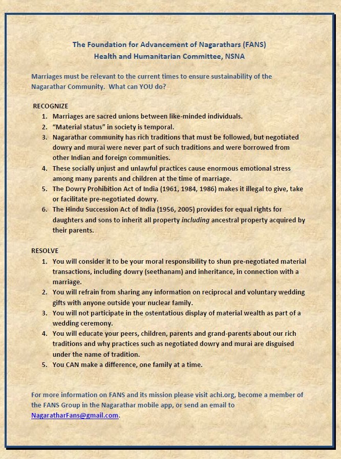 FANS believes that the NSNA youth are well positioned to fight against this unfair practice. Every Nagarathar youth in the USA should resolve to proactively ensure that there will not be any demanded material transactions done as part of marriage.